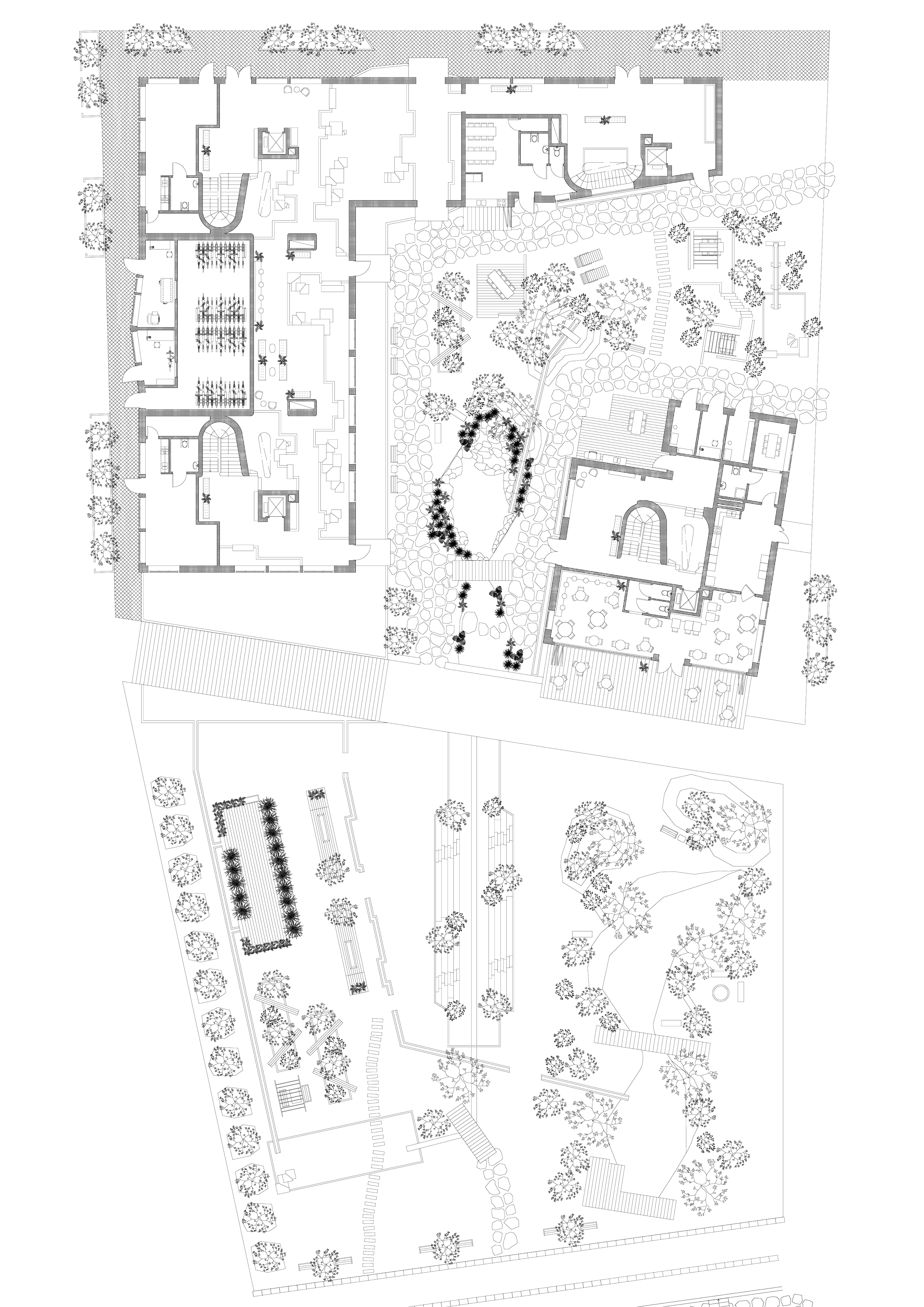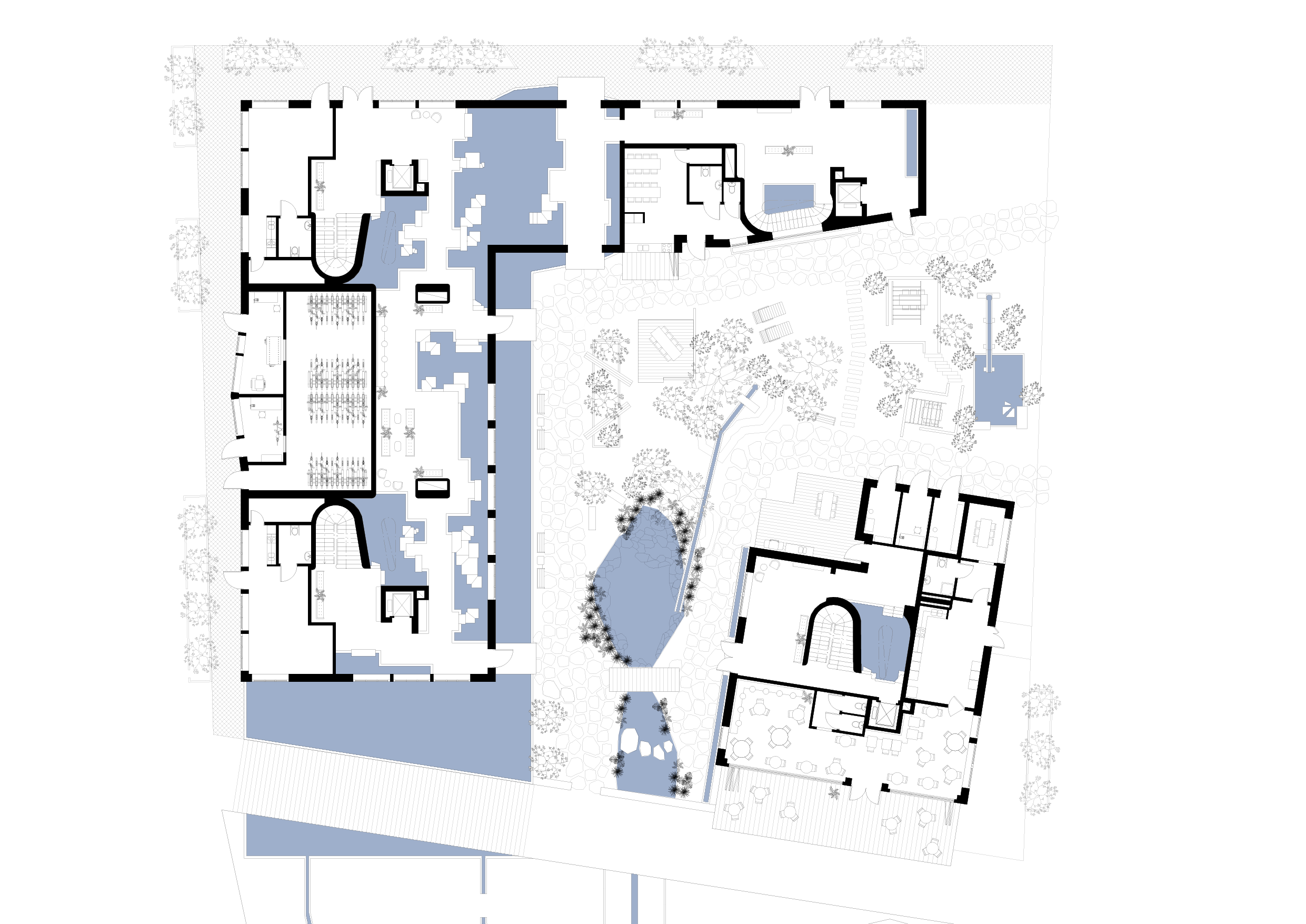 Rainwater collected from rooftops and basins supplies washing machines and toilets, while potable water is reserved for taps and showers. Surplus rainwater irrigates the courtyard, with the rest discharged to the municipal system. This strategy merges sustainability with sensory design, making water both a shared utility and a spatial experience that raises awareness of consumption and value.