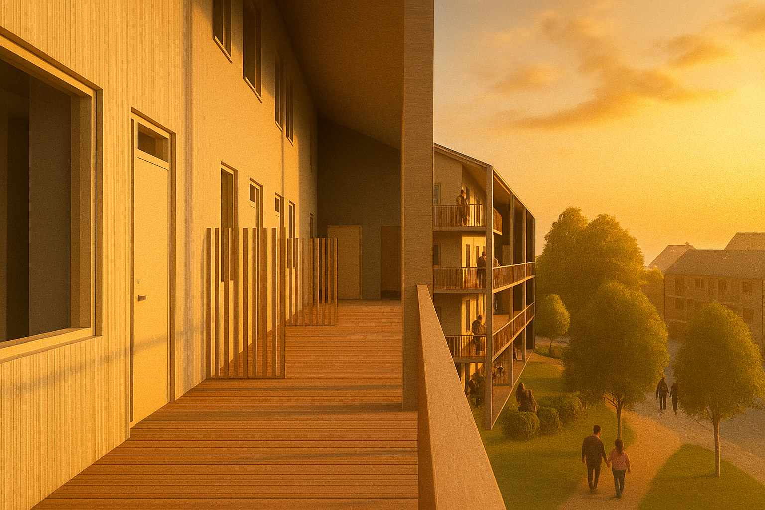 The loft corridor provides access while doubling as a semi-private space, allowing each apartment a personal outdoor extension within the shared structure.