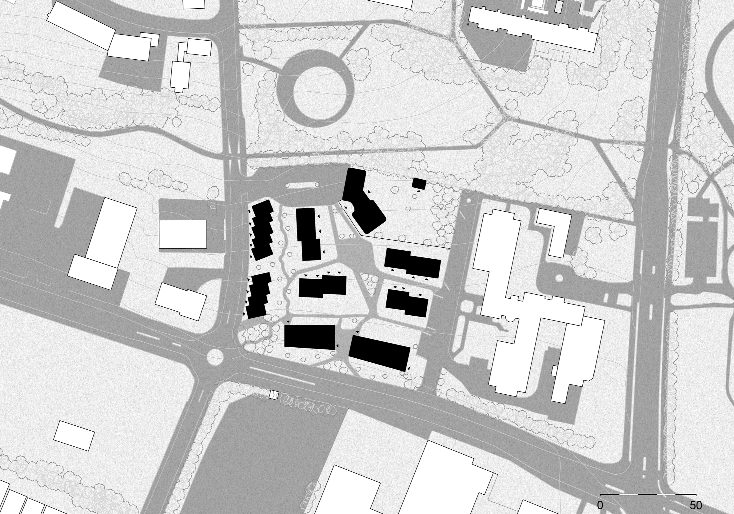The buildings’ timber facades and varied volumes create a small-scale village character, blending sustainability with a welcoming atmosphere in the heart of the city.